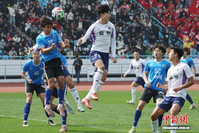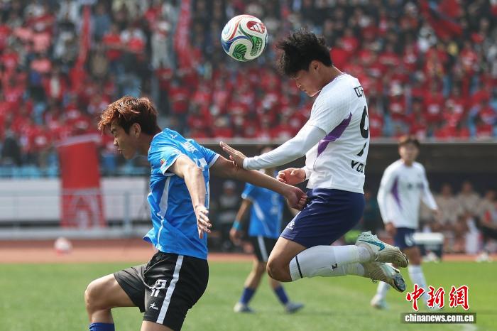 3月25日,江苏常州取湖北永州脚球情义交换赛正在常州奥体主旨运动场举办,终究,常州队1比0打败永州队。角逐进程中,两边球员拼劲统统,不雅赛球迷热中飞腾。图为常州队球员(黑衣)取永州队球员(蓝衣)正在角逐中拼抢。中新社记者 泱波 摄