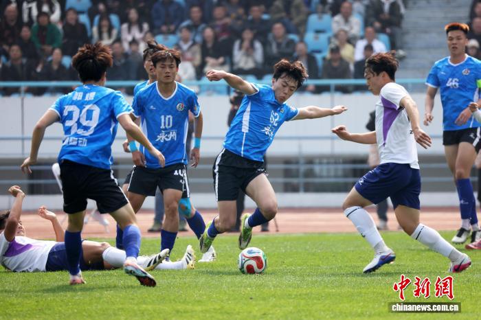 3月25日,江苏常州取湖北永州脚球情义交换赛正在常州奥体核心运动场举办,终究,常州队1比0打败永州队。角逐进程中,两边球员拼劲完全,不雅赛球迷亲昵上涨。图为常州队球员(黑衣)取永州队球员(蓝衣)正在角逐中拼抢。中新社记者 泱波 摄